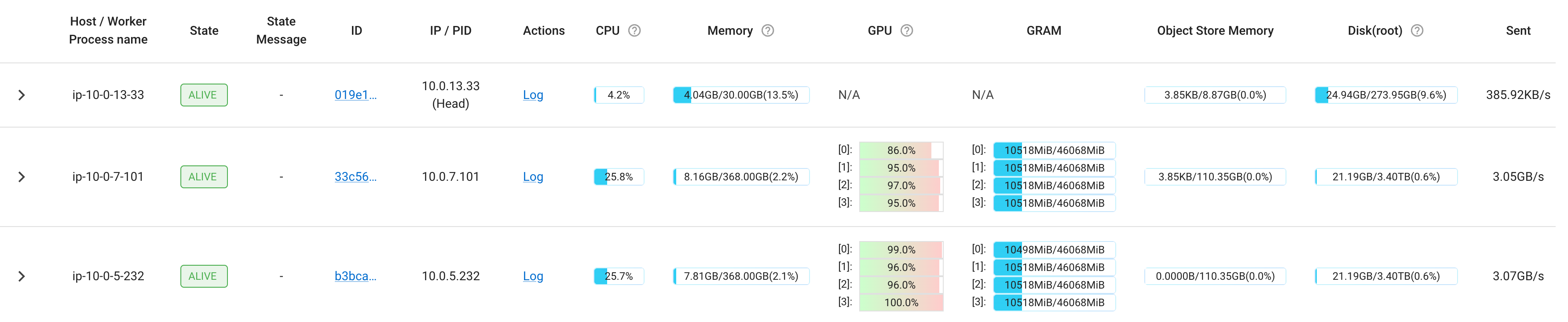 Coming back to the example on a Ray cluster with 1 head node and 2 4xL40S worker nodes, let’s say you want to make use of all 8 GPUs. You would be able to just set ray_num_workers: 8 and run the previous command. The Cluster tab will show the following: